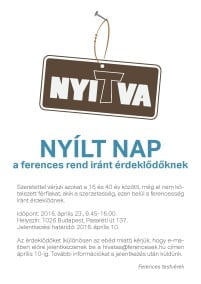 Nyílt napot tartanak a ferencese április 23-án 9.45-től 16 óráig a pasaréti rendházban (Budapest, Pasaréti út 137.) a szerzetesség, ezen belül a ferencesség iránt érdeklődő 16 és 40 év közötti, még el nem kötelezett férfiaknak. Az érdeklődők e-mailben jelentkezhetnek április 10-ig a címen. Ferences testvérek