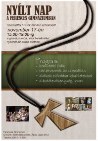 A szentendrei Ferences Gimnázium 6. és 8. osztályos gyermekek és szüleik számára november 17-én 15-19 óra között nyílt napot tart. A program 15 órakor a kápolnában kezdődik, P. Lukovits Milán igazgató mutatja be az intézményt. Utána harmincperces bemutató tanórákon vehetnek részt az érdeklődők, majd játékos programok várják az érdeklődő gyermekeket és szüleiket. 18,30-kor közös vacsorára.