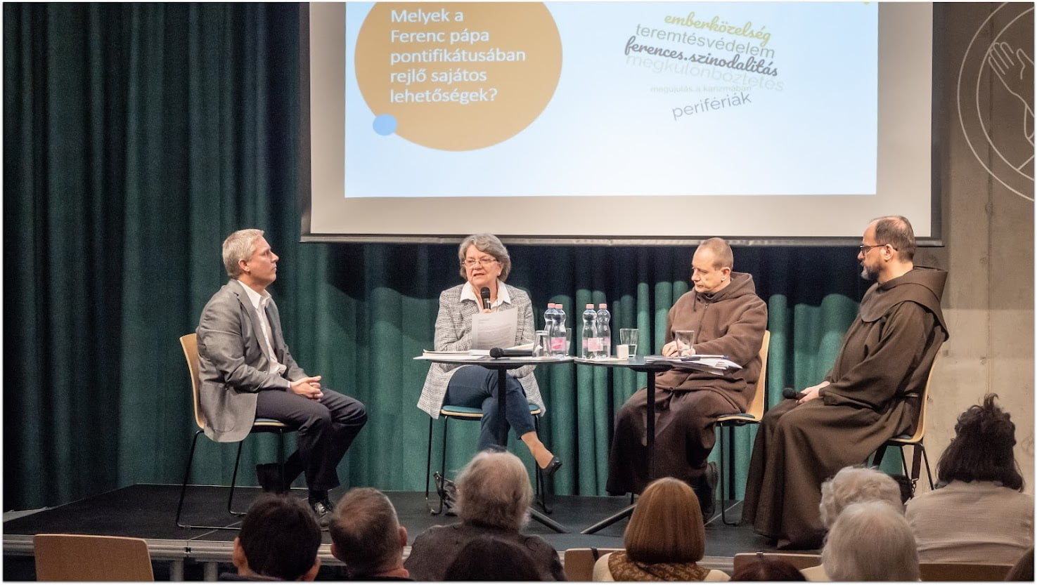 Horváth Éva felidézte, mennyire örültek, amikor a pápa megválasztásakor kiderült, hogy éppen Assisi Szent Ferenc miatt választotta a Ferenc nevet; ugyanakkor időnként úgy érzi, Ferenc pápa jezsuitaként éli, értelmezi a ferences karizmát. Az egyházfő rendszeresen kilép a komfortzónájából, és ez követnivaló példa számunkra is, hisz hajlamosak vagyunk bezárkózni a saját belterjes köreinkbe. Ferencesnek látja a pápában például azt, hogy gyakran hangsúlyozza az öröm és a remény jelentőségét.