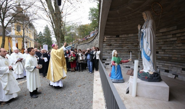 Az új lourdes-i barlang az idősek számára jobban megközelíthető, a szent kút mellett van, amely még jobban kiemeli a nagy zarándokhellyel, Lourdes-dal való lelki kapcsolatát és a templomban lévő kegyszobor jelentőségét, hiszen eddig sokan azt hitték, hogy a lourdes-i Szűz Mária a hely kegyszobra. A szabadtéri oltár mozaikkompozíciója pedig Szent Péter székével való egységünk megjelenítője – ami a basilica minor titulus, a búcsúnyerés miatt e kegyhelyen különösen is fontos. Központi motívuma Mária megkoronázásának ábrázolása – a római Santa Maria Maggiore-bazilika apszismozaikja nyomán –, szimbolikája a nyugati egyház jelképrendszerét követi, a magyar szentek alakjai pedig mintegy összefoglalják történelmi identitásunkat. Azt szeretnénk, ha az ideérkező zarándokok egy olyan utat járnának be a Szűzanya szeretetétől övezve, amely a megérkezés után a gyóntatószéknél folytatóik, az Eucharisztiához vezet és a szentek közösségében találja meg „kifutását”.