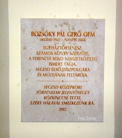 A IV. Béla király nevét viselő segesdi iskolában folytatódott az ünnepség. A település új díszpolgára, Kovács Bánk atya egészségi okokból személyesen nem lehetett jelen, beszédét azonban, melyben gyermekkora segesdi mindennapjait, az akkori ferences atyák alakját és a háborús éveket elevenítette fel, felolvasták. Magyar Kálmán régész, aki a középkori Segesd tudós kutatója és Marics József berzencei plébános, egyházi író Bozsóky Gerő életútját, szakmai és emberi kvalitásait méltatta, aki a Sorbonne-on tanult, és élete nagy részét párizsi emigrációban töltötte. A ferences történész életműve igen szerteágazó. Segesd, illetve Somogy középkori történetét, annak ferences vonatkozásait, a magyarság kereszténységre térésének folyamatát, Árpád-házi Szent Erzsébet francia kultuszát, a Szent István király által alapított jeruzsálemi zarándokház történetét, a keresztes háborúk és a jeruzsálemi keresztény királyság korát, de a kommunista időszak magyar egyháztörténetét, illetve a francia egyház–állam viszonyt szintén kiválóan ismerte, e témákból igen sok publikációja látott napvilágot.